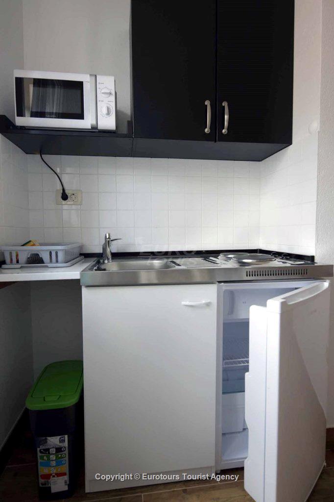 Kitchen: open kitchen, ceramic glass hob, cooker, fridge with freezer, microwave oven, electric kettle + cutlery and drink.