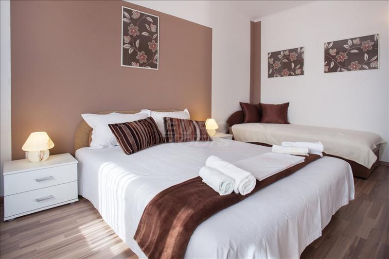 There is kitchen with living room, 3 bedrooms with queen size beds (one of bedrooms has additional bed), 3 bathrooms and large hallway. Each room has it's own balcony.