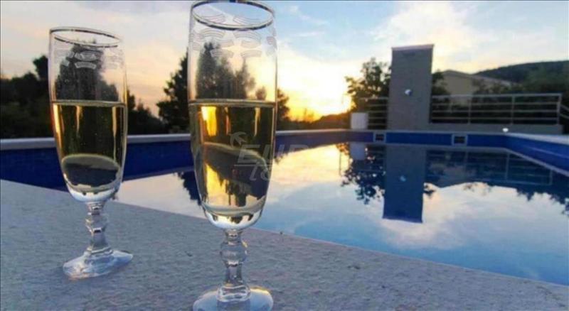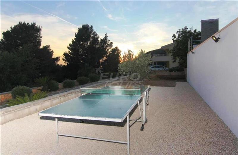 Outdoor area features private seasonal pool with sunloungers and oudoor shower, spacious terrace with dining area and outdoor lounge area, dalmatian barbecue with all required facilities, kid's oudoor play equipment (table tennis), garden.