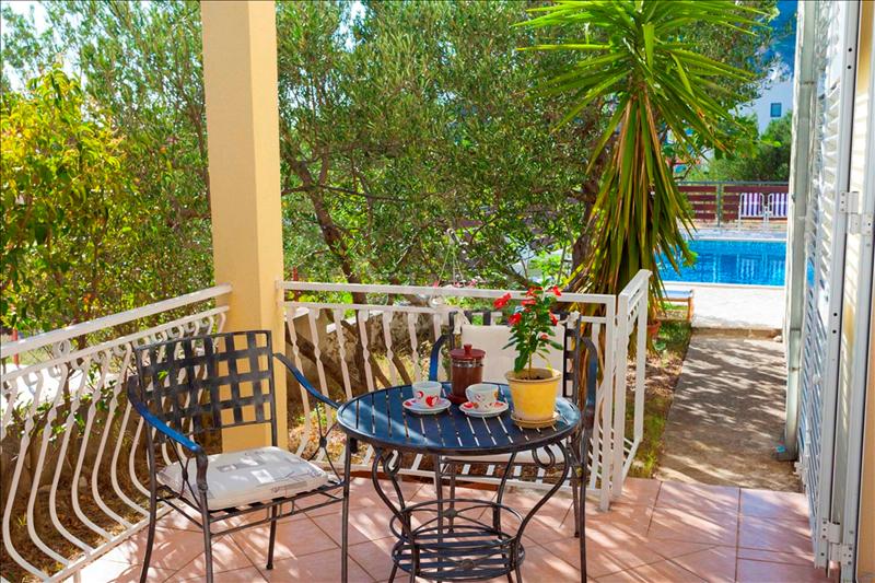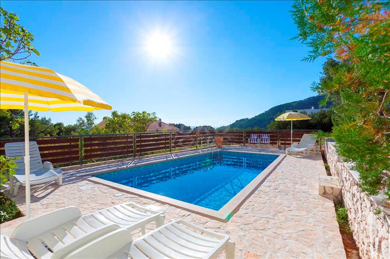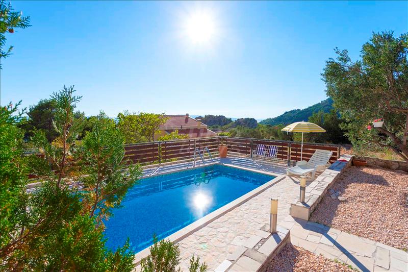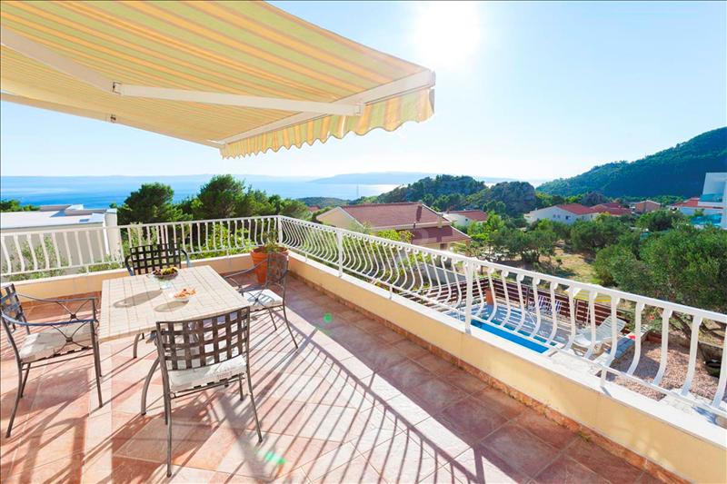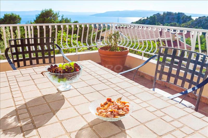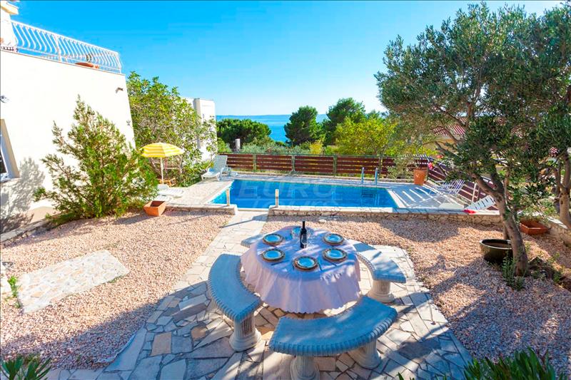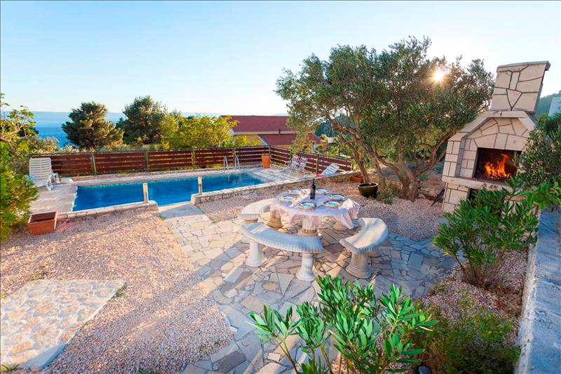 Highlight: large terrace with private pool 8 x 4 m, depth 1.7 m leaves nothing to be desired, sun loungers, garden furniture, outdoor shower, entertainment swings for children . The terrace is beautifully landscaped. It looks out over the open sea. Attached to this part is a terrace with fireplace BBQ - locally called Kamin- for open air dining and relaxation. Villa offers a magnificent view of the sea and the islands of Brac and Hvar, on the other side, overlooking the Biokovo Mountain.