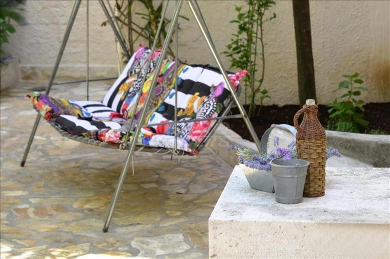 The backyard terrace, which is completely fenced off by a stone wall, creates the perfect ambience for relaxation and a peaceful holiday. The beautiful property offers complete privacy for the guests.