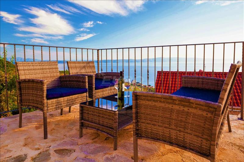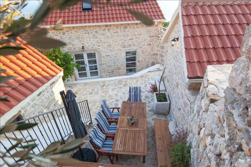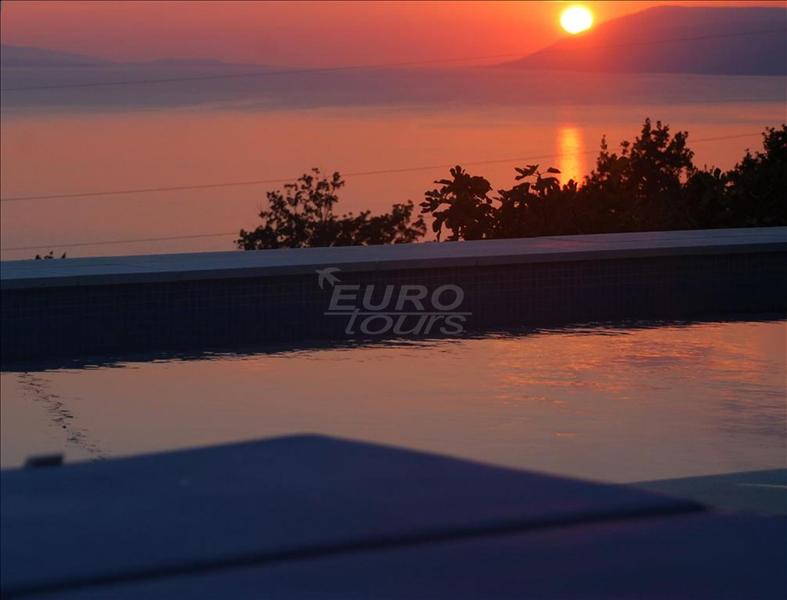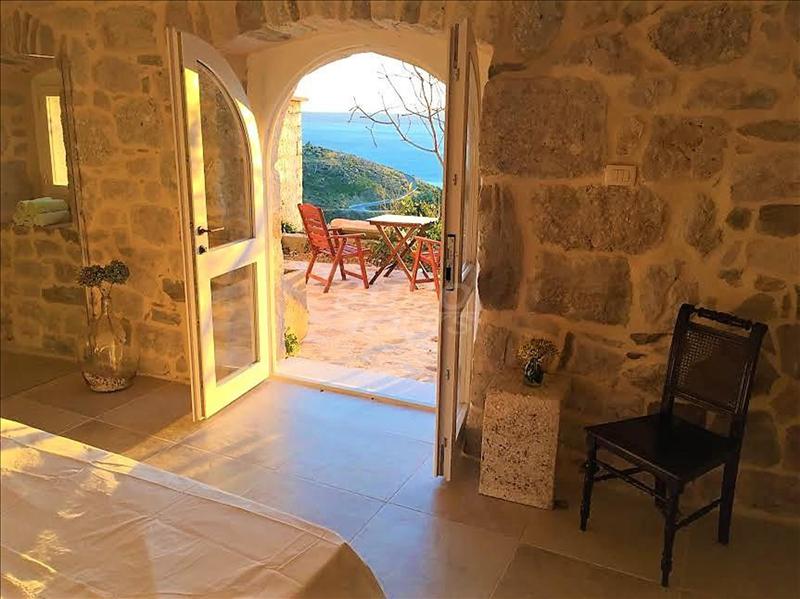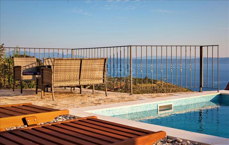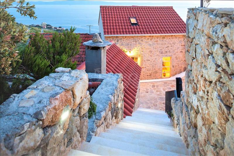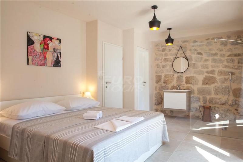 Amazing stone Villa consists of three houses, a garden with dining table and a pool area. Villa Sunset Panorama offers you an unforgettable atmosphere and modern amenities for a comfortable stay, including air conditioning in all rooms. The main house consists of a living and dining room, a fully equipped modern kitchen and two bedrooms, each with its private luxurious bathroom. All rooms enjoy stunning panoramic views over the sea. The garden with rosemary, laurel and lavender also has a table and chairs and a pool area with sun loungers. In the second house is the third bedroom with a double bed and private bathroom. Fireplace with chairs and table is located in the third traditionally decorated stone house.
