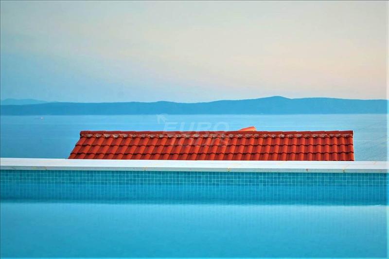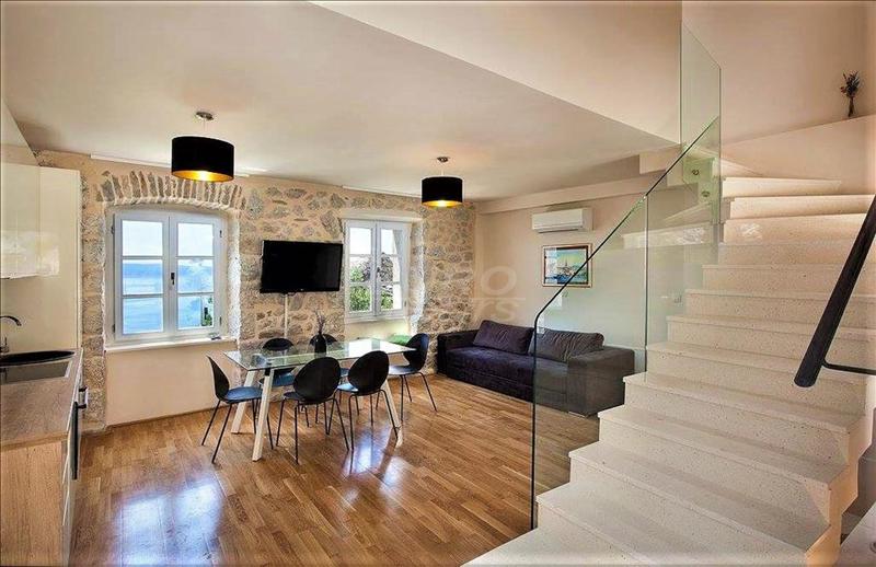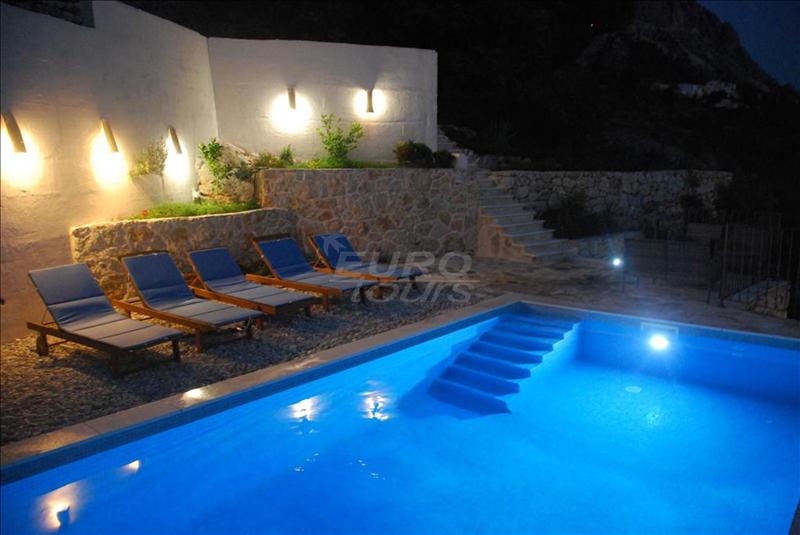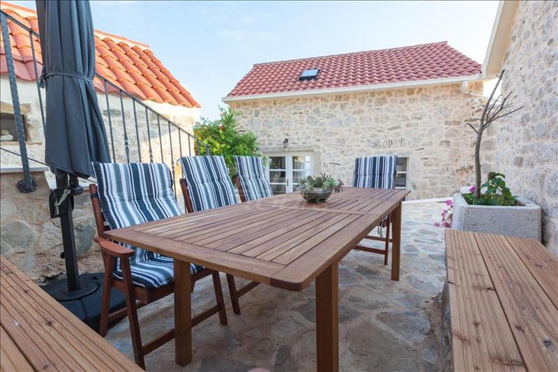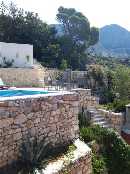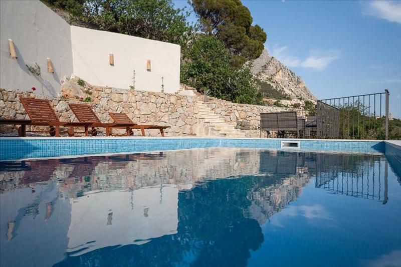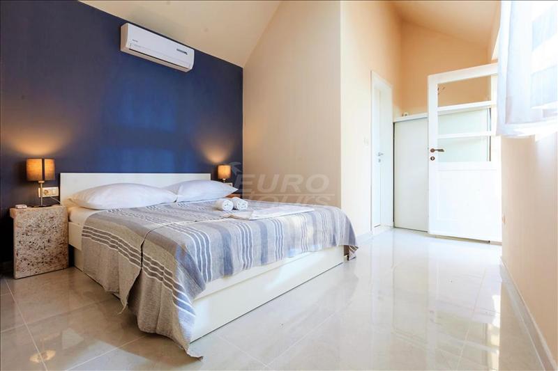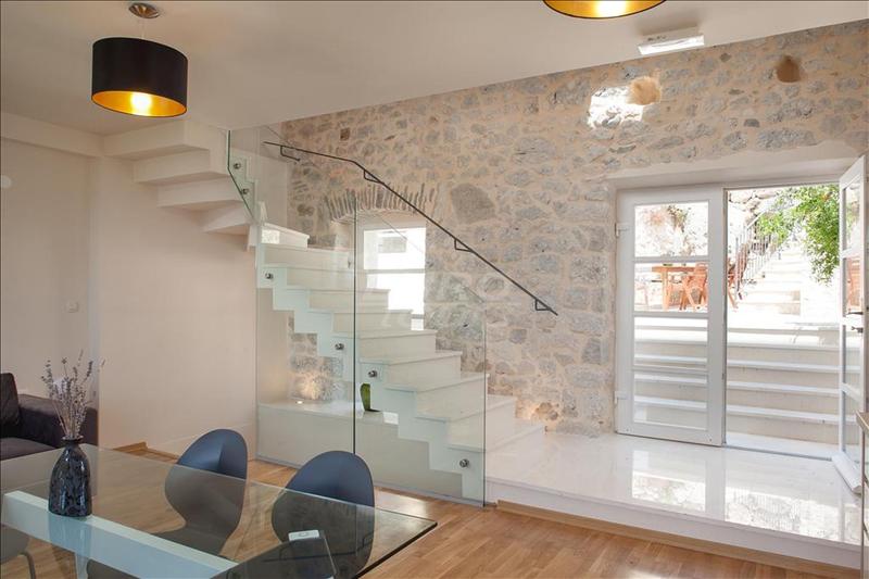 Amazing stone Villa consists of three houses, a garden with dining table and a pool area. Villa Sunset Panorama offers you an unforgettable atmosphere and modern amenities for a comfortable stay, including air conditioning in all rooms. The main house consists of a living and dining room, a fully equipped modern kitchen and two bedrooms, each with its private luxurious bathroom. All rooms enjoy stunning panoramic views over the sea. The garden with rosemary, laurel and lavender also has a table and chairs and a pool area with sun loungers. In the second house is the third bedroom with a double bed and private bathroom. Fireplace with chairs and table is located in the third traditionally decorated stone house.